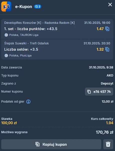 Rzeczywiście nieco bardziej zmęczeni do konfrontacji przystąpią siatkarze Energi Trefla. W końcu to oni grali 2-krotnie tie-breaki w pierwszych 2 kolejkach. Tyle tylko, że w tym czasie pokazali, że też potrafią odrabiać straty (z niżej notowanymi) jak i zaskakiwać (z mocniejszymi od siebie). W dodatku i jednym, i drugim zdarza się grać falującą siatkówkę. Dlatego też na 2. siatkarski typ z kodem promocyjnym STS-u wolę wybrać to, że zostanie rozegrany 4. set, niż wskazywać, która drużyna okaże się lepszą. Zanosi się na typowy mecz walki, w którym o wygranej będą decydować detale. Żaden z zespołów nie ma aż takiej przewagi nad przeciwnikiem, by nagle wygrać do zera.