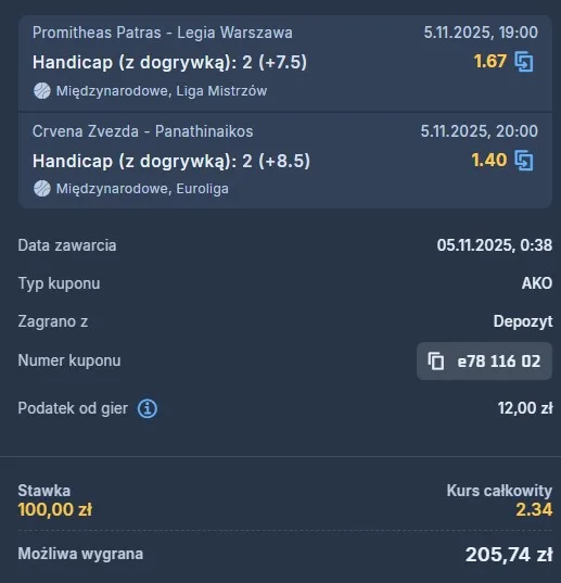 W pierwszym starciu obu drużyn Promitheas Patras wygrał z Legią Warszawa 68:64, choć warszawianie przez długi czas stawiali bardzo mocny opór i byli nawet bliscy triumfu. Spotkanie wymknęło im się z rąk dopiero w ostatniej kwarcie. Od tamtej pory sytuacja wygląda jednak inaczej – Legia jest na fali, bo od tego meczu zanotowała cztery kolejne zwycięstwa z rzędu, prezentując coraz lepszą formę. Grecy natomiast przegrali trzy z ostatnich czterech meczów, co wyraźnie pokazuje ich spadek dyspozycji. Typuję handicap +7.5 dla Legii Warszawa. Zachęcam do regularnego obserwowania zakładki typy dnia lub do sprawdzenia innych propozycji na Zagranie!