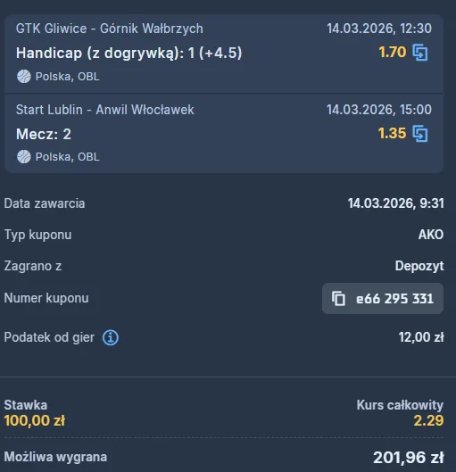 Dzisiejszy mecz będzie dla Górnika Wałbrzych już trzecim spotkaniem w ciągu tygodnia. W międzyczasie zespół rozgrywał bardzo ważne starcie – derby Dolnego Śląska ze Śląskiem Wrocław. Taki terminarz może odbić się na dyspozycji drużyny, tym bardziej że w ostatnim czasie pojawiały się różne drobne urazy w zespole. Do tego spotkanie odbywa się w Gliwicach, gdzie GTK potrafi grać naprawdę solidnie. Przekonały się o tym już w tym sezonie takie zespoły jak Anwil Włocławek czy Trefl Sopot, które musiały się tam mocno napracować. Dlatego uważam, że dla Górnika to może być trudne spotkanie. Typuję handicap +4.5 dla GTK Gliwice, które na własnym parkiecie powinno być bardzo wymagającym rywalem. Zachęcam do regularnego obserwowania zakładki typy dnia lub do sprawdzenia innych propozycji na Zagranie!