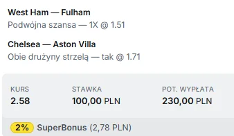 Aston Villa dowozi w ostatnich tygodniach fenomenalne wyniki, jednak wciąż musi popracować nad koncentracją na wyjazdach, szczególnie w pierwszych minutach spotkań – w czterech z pięciu ostatnich takich meczów traciła gola już w pierwszych dziewięciu minutach. Chelsea z kolei również ma swoje problemy w defensywie, co potwierdza pięć straconych bramek w ostatnich czterech spotkaniach, dlatego spodziewam się otwartego meczu i typuję BTTS, bo obie drużyny mają wyraźne argumenty w ofensywie. Zachęcam do regularnego obserwowania zakładki typy dnia lub do sprawdzenia innych propozycji na Zagranie!