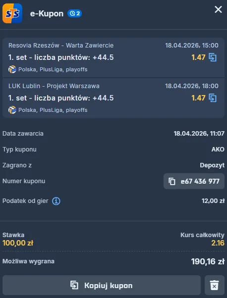 Ponadto, siatkarze BOGDANKA LUK utrzymują równiejszą formę ostatnimi czasy. Zwyciężali w poprzednich 4 występach. W analogicznym czasie stołeczna drużyna lepszą okazała się tylko raz. Dnia 7 kwietnia u siebie ograła zespół JSW Jastrzębski Węgiel. Choć w tym miejscu warto pamiętać, że 2 porażek doświadczyli, będąc po 5-setowych bataliach. Dlatego też odnośnie do tego meczu, obstawiam jako 2. typ dnia z kodem promocyjnym STS, że drużyny w 1. secie zdobędą przeszło 44 oczka. Po premierowej odsłonie wydarzyć może się wiele, ale to zależy od tego, kto wygra tę partię.