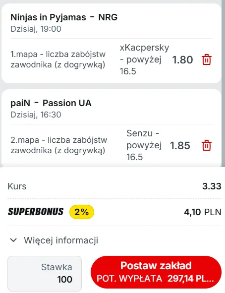 Typ: xKacpersky powyżej 16.5 zabójstw (1. mapa). Polak robi w tym sezonie co tylko może, żeby uratować drużynę. Koledzy jednak średnio mu w tym pomagają, ale NIP trafiło na idealnego rywala. NRG gra bardzo słabo pod względem indywidualnym na tym turnieju. Spodziewam się, że Kacpersky zagra bardzo dobre spotkanie i przynajmniej sprawi, że NIP utrzyma się dalej w turnieju