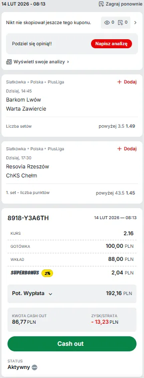 Od siebie obstawiam jako 2. typ dnia, który jest stawiany z kodem promocyjnym Superbet to, że w tym starciu drużyny w premierowej odsłonie zdobędą przeszło 43 punkty. Rzeczywiście w ich poprzednim starciu drużyny zdobyły w tej partii 42 oczka. Jednak wtedy w znacznie gorszej sytuacji był zespół InPost ChKS. Reprezentujący barwy tego klubu nie byli ani w takiej formie, ani zdrowiu; a też rzeszowianom w tym sezonie po świetnym meczu przydarzał się mizerniej zagrany.