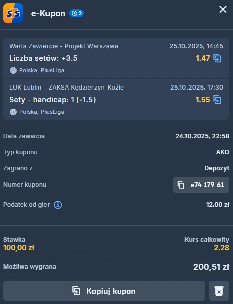 Dlatego też tutaj trudniej jest wskazać zwycięzcę niż, choćby w przypadku tej rywalizacji, do której dojdzie dziś w Lublinie. W końcu większość zawodników PGE Projektu już miała okazję przyzwyczaić się do grania, co 3/4 dni, czego dowodem jest łączenie startów w krajowych rozgrywkach z występami w Europie. Tym samym z kodem promocyjnym STS-u nie wskazuję samego wygranego, a „tylko” to, że każdy z zespołów zdobędzie przynajmniej seta. Tu nikt nie ma tak wysokiej przewagi nad drugim, by wygrać do zera.