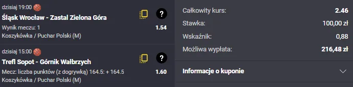 Górnik jest w Pucharze Polski naprawdę nieobliczalny. Podobnie jak w poprzedniej edycji Pucharu pokazuje, że w tych rozgrywkach czuje się wyjątkowo pewnie. Drużyna jest niesiona przez trybuny, pojawiają się nieoczywiści bohaterowie i widać, że w takich turniejowych realiach potrafią wejść na wyższy poziom energii. Jedno jest pewne – Górnik tego meczu łatwo nie odda. Co ciekawe, oba zespoły mierzyły się ze sobą zaledwie tydzień temu i wtedy padło aż 191 punktów. Tempo było wysokie, defensywa momentami schodziła na dalszy plan. Myślę, że dziś również zobaczymy sporo trafień – typuję, że w meczu padnie powyżej 164,5 punktu. Pamiętaj, że czekają na Ciebie tylko i wyłącznie legalni bukmacherzy!