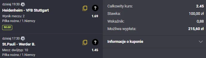 Heidenheim tak naprawdę nie ma większych argumentów przed tym meczem. Różnica jakości, organizacji gry i indywidualnych umiejętności jest wyraźnie po stronie Stuttgartu. Gospodarze musieliby liczyć na splot sprzyjających okoliczności, by realnie zagrozić rywalowi. Jedynym czynnikiem, który teoretycznie mógłby utrudnić życie Stuttgartowi, jest niedawny wyjazd do Glasgow i napięty terminarz. Jednak szeroka kadra oraz mądre rotacje Sebastiana Hoeneßa sprawiają, że nie powinno to znacząco wpłynąć na jakość gry. Typuję zwycięstwo gości. Zachęcam do regularnego obserwowania zakładki typy dnia lub do sprawdzenia innych propozycji na Zagranie!