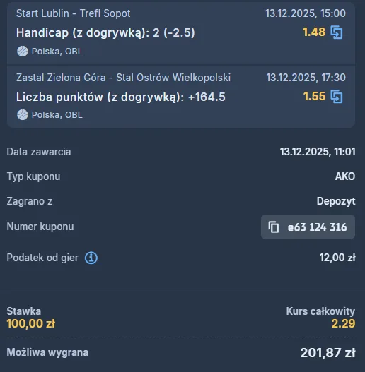 Start notuje porażkę za porażką, a jego sytuacja stała się jeszcze trudniejsza, gdy zespół został pozbawiony swojego najlepszego zawodnika, którego odejście nie zostało w żaden sposób zrekompensowane. Brak realnego zastępstwa tylko pogłębia problemy drużyny, która już wcześniej wyglądała na zagubioną i pozbawioną argumentów, by rywalizować na równym poziomie nawet ze słabszymi ekipami. Trudno więc oczekiwać nagłej poprawy, zwłaszcza że Start mierzył się już z teoretycznie łatwiejszymi rywalami i nie przyniosło to żadnego przełomu ani zmiany obrazu gry. Tymczasem Trefl Sopot znajduje się na zupełnie innym biegunie. W ostatniej kolejce sopocianie pokonali na wyjeździe Legię Warszawa – co prawda mierzącej się z wieloma kontuzjami, ale zwycięstwo nad aktualnym mistrzem Polski nigdy nie jest łatwą sztuką. Patrząc na obecną formę obu zespołów, różnicę jakości oraz sytuację kadrową Startu, wszystko wskazuje na to, że kolejna porażka lublinian jest bardzo realnym scenariuszem. Typuję zwycięstwo Trefla Sopot z handicapem -2.5. Pamiętaj, że czekają na Ciebie tylko i wyłącznie legalni bukmacherzy!