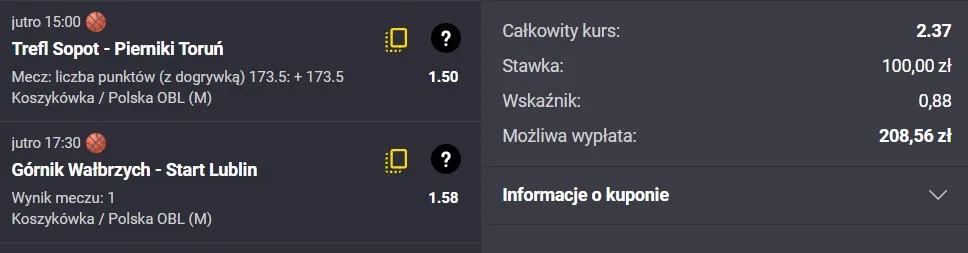 Trefl Sopot w ostatnich czterech meczach tracił kolejno 97, 100, 85 oraz 100 punktów, co jasno pokazuje, jak duże problemy ma w defensywie. Dla tak ofensywnie nastawionego zespołu jak Twarde Pierniki Toruń to wręcz idealna sytuacja. Co więcej, torunianie sami również nie słyną z twardej obrony, więc możemy spodziewać się otwartego, szybkiego meczu. Jak to mają w zwyczaju, spróbują „przerzucić” rywala punktami, co tylko zwiększa szanse na wysoki wynik. Dlatego typuję powyżej 173.5 punktu w meczu. Pamiętaj, że czekają na Ciebie tylko i wyłącznie legalni bukmacherzy!