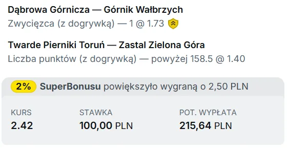 Spotkanie zapowiada się emocjonująco, bo oba kluby prezentują zbliżony poziom, a rywalizacja może toczyć się punkt za punkt. Skupiam się jednak na liczbie oczek – ostatnie występy Twardych Pierników były bardzo skuteczne w ofensywie, padały kolejno wyniki 196, 188, 209, 161 i 175 punktów. Zastal ostatnio również imponował pod względem punktowym w meczu ze Startem Lublin. Typuję, że w tym spotkaniu padnie powyżej 158,5 punktów. Pamiętaj, że czekają na Ciebie tylko i wyłącznie legalni bukmacherzy!