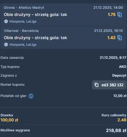 Atlético Madryt w tym sezonie wyraźnie nie radzi sobie na wyjazdach – w ośmiu meczach poza własnym stadionem zdobyło zaledwie 9 punktów, co zdecydowanie nie przystaje do aspiracji tego zespołu. Girona FC z kolei potrzebuje punktów jak tlenu, bo każda zdobycz może mieć ogromne znaczenie w kontekście walki o utrzymanie. Dodatkowo Atlético w ostatnich tygodniach mocno kuleje w defensywie – w trzech poprzednich spotkaniach straciło łącznie pięć bramek, a rywale nie należeli do szczególnie wymagających. Biorąc pod uwagę problemy madrytczyków w obronie, wyjazdową niemoc oraz desperację Girony, typuję, że w tym meczu obie drużyny strzelą gola (BTTS). Pamiętaj, że czekają na Ciebie tylko i wyłącznie legalni bukmacherzy!