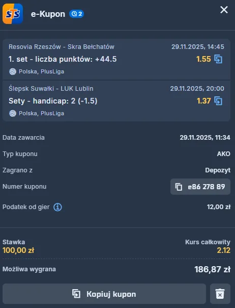 Podsumowując, moim 2. typem siatkarskim, który jest stawiany wraz z kodem promocyjnym STS-u, jest wskazaniem na to, że aktualni mistrzowie Polski zwyciężą za 3 punkty. Przy obecnej formie i jakości obu ekip, a także ich sytuacji zdrowotnej i pozostałych okolicznościach; za realne zakładam, że raz jeszcze zgubią maksymalnie jednego seta. W końcu wciąż szukają sposobu na to, jak utrzymać równy poziom grania na dystansie całej konfrontacji.