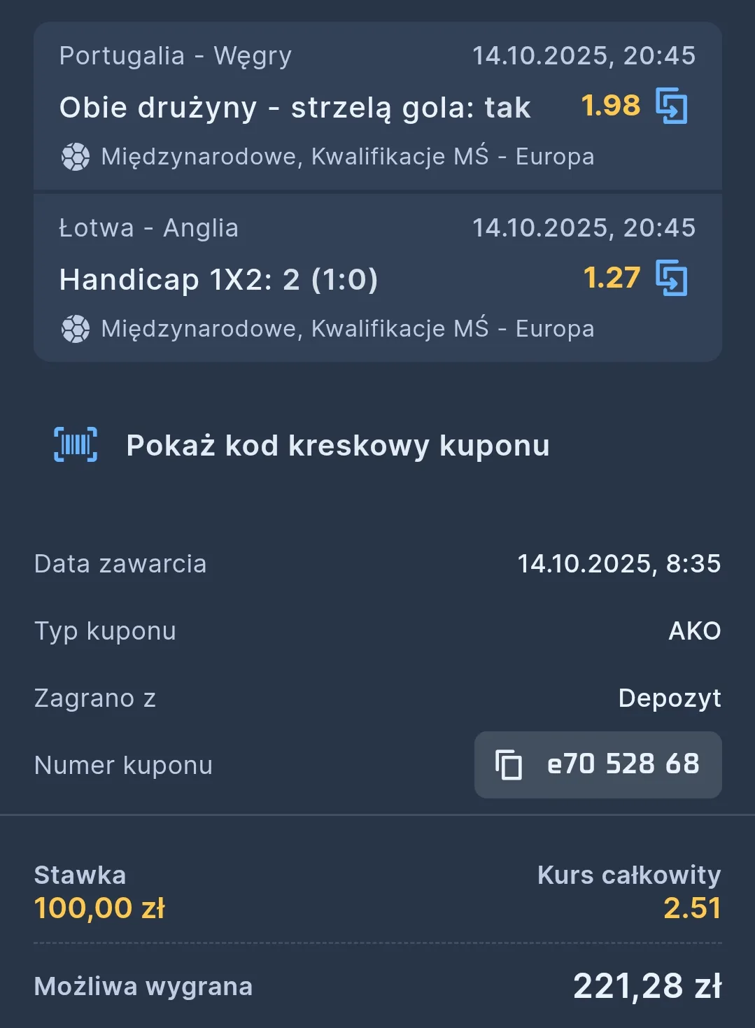 Przygotowaliśmy kod promocyjny STS, dzięki któremu możesz zgarnąć atrakcyjne bonusy na start! Portugalia po spektakularnym triumfie w Lidze Narodów idzie za ciosem i jak na razie nie pozostawia rywalom złudzeń – wygrała wszystkie trzy mecze eliminacyjne. Choć przeciwnicy nie należą do czołówki Europy i prezentują raczej poziom dywizji B, Portugalczycy dominują każdy pojedynek. Strzelili już 9 bramek, dwukrotnie zachowując czyste konto. Jedynym mankamentem pozostaje skuteczność – mimo imponujących statystyk xG, często kończą mecze z mniejszym dorobkiem bramkowym niż wskazywałby przebieg gry. Poza tym to kadra pełna jakości, doświadczenia i ofensywnej mocy, która może celować naprawdę wysoko.