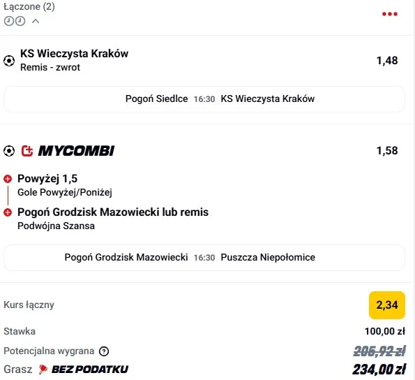 Jakościowo Wieczysta Kraków znajduje się dziś kilka poziomów wyżej od Pogoni Siedlce. Mimo że krakowianie wciąż nie grają na miarę swoich realnych możliwości i zdarzają im się przestoje, to pod względem potencjału, szerokości kadry i indywidualnych umiejętności pozostają drużyną wyraźnie lepszą. Pogoń na swoim obecnym poziomie, zwłaszcza patrząc na ostatnie osiem kolejek, w których uzbierała zaledwie dziewięć punktów, nadal nie prezentuje formy pozwalającej na równą walkę z jednym z głównych faworytów ligi. Właśnie dlatego typuję zwycięstwo Wieczystej Kraków – a przy ewentualnym remisie zwrot. Zachęcam do regularnego obserwowania zakładki typy dnia lub do sprawdzenia innych propozycji na Zagranie!