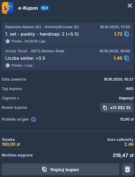 Takiego, w którym szala zwycięstwa będzie się przechylała. Rzeczywiście bardziej ograny w PLS 1. Lidze i w teoretycznie nieco wyższej formie jest BBTS. Jednak siatkarze Avii Świdnik pokazali, że prawdą jest, że dla chcącego nic trudnego. Ponadto, jak pokazało ostatnie starcie między tymi zespołami, CUK Anioły potrafią zdobyć więcej niż doprowadzenie do zaciętej końcówki 1. seta. Stąd też wraz z kodem promocyjnym STS-u koniec końców obstawiam, że 2. raz z rzędu zostanie rozegrany 4. set.
