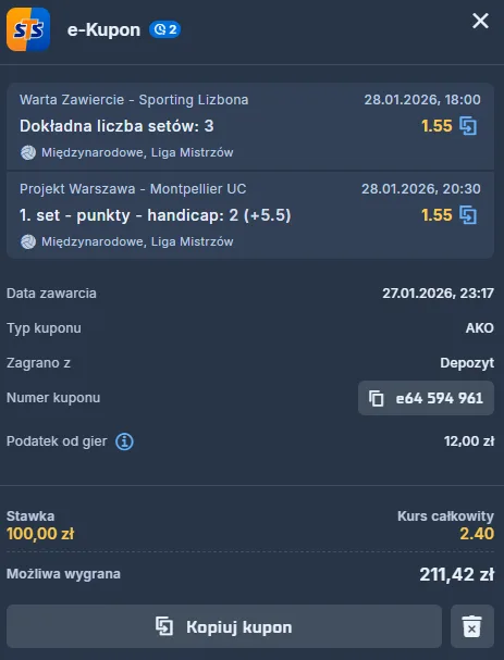 … przez co trudniej byłoby wytypować wynik. Jednak w chwili obecnej zmian spodziewam się dopiero wtedy, kiedy wynik będzie już pod pełną kontrolą zawiercian. W dodatku zagrają u siebie, przez co spodziewam się, że to starcie zakończy się po rozegraniu raptem 3 setów i to też obstawiam z kodem promocyjnym STS.