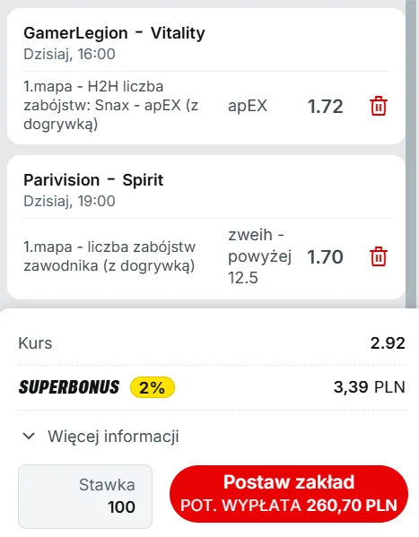 Typ: Zwieh powyżej 12.5 zabójstw (1. mapa). Zweih w dwóch pierwszych meczach w nowych barwach zagrał świetnie i zdobył rating 1.61. Pierwsza mapa powinna być wyborem Parivision i zdecydowanie powinni na niej powalczyć. Linia na Zweih jest bardzo niska, a przecież dobrze wie jak gra i działa Spirit. Myślę, że może się zrewanżować swojej byłej drużynie i pokaże się z bardzo solidnej strony.